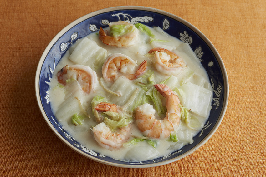 - えびは尾とひと節を残して殻をむき、背わたを取る。塩少々(材料外)をふってもみ、水洗いして水気をきる。白菜は軸と葉に切り分け、軸は長さ3cmのそぎ切り、葉は長さ3cmに切る。Aは混ぜる。