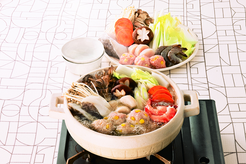 - たらはひと口大に切り、ほたては横半分に切る。えびは殻をむいて背わたを取り、白菜はそぎ切りに、長ねぎは斜め切りに、えのきは根元を切ってほぐし、まいたけは石づきを取ってほぐし、しいたけは石づきを取って笠に飾り包丁を入れる。にんじんは1cmの厚さの輪切りにする。