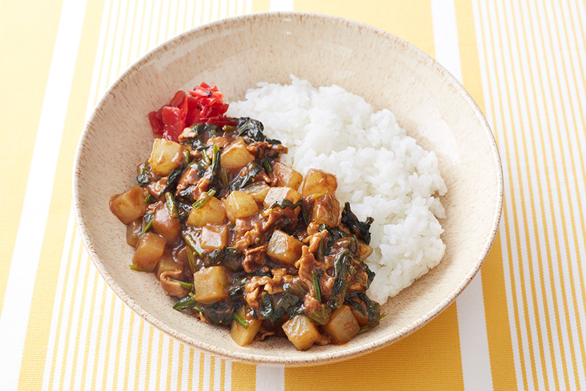 - フライパンに油を中火で熱し、しょうがを炒める。香りが立ったら大根を加えて透き通るまで炒め、豚肉を加えて色が変わるまで炒める。ほうれん草を加えてサッと炒め、材料の水を加えて混ぜ、ふたをして弱めの中火で5分煮る。