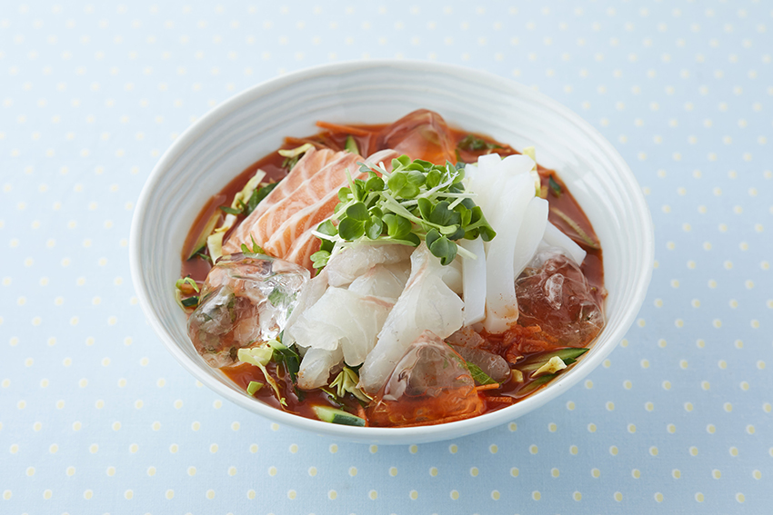 - 器にキャベツ、きゅうり、にんじん、青じそを敷いて、いか、鯛、サーモン、かいわれ菜をのせ、2を注ぐ。氷を浮かべ、混ぜながら食べる。※〆に冷たいごはんを汁に入れて食べるのもおすすめです。