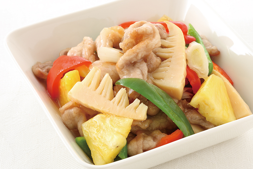 - パイナップル、たけのこはひと口大に、赤ピーマン、ピーマンは乱切りに、長ねぎは短めの斜め切りにする。