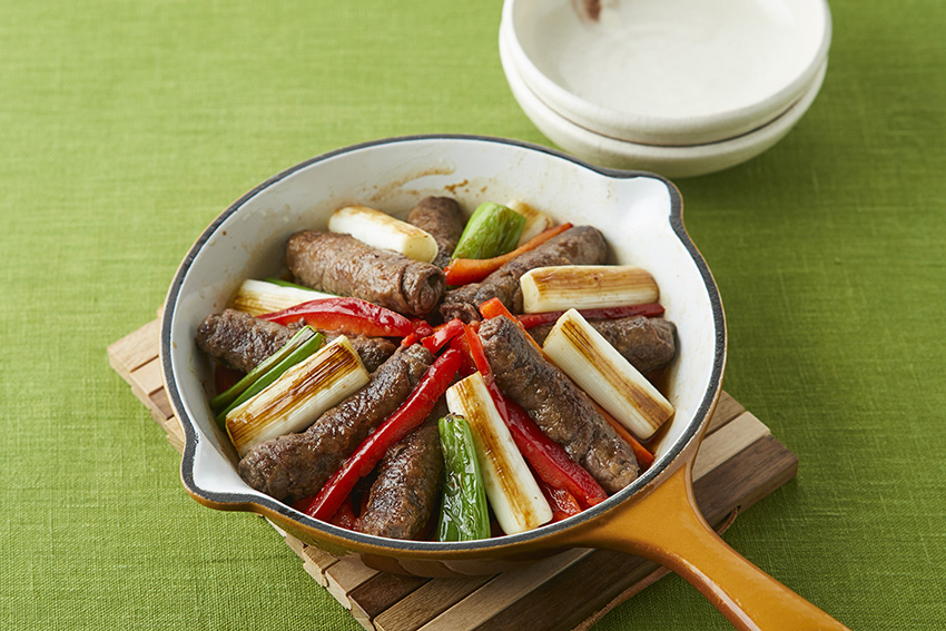 - 直径20cmほどのフライパンに油を中火で熱し、牛肉と長ねぎを入れて1~2分、焼き色がつくまで焼き、返して1分焼いて取り出す。